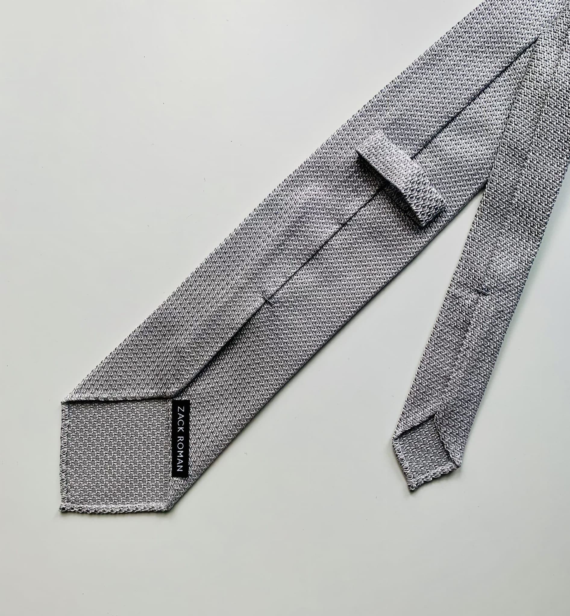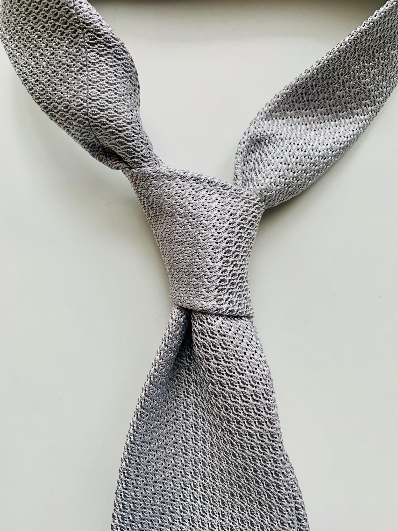 Charakterystyczny splot grenadyny, przypominający dzianiny, jest równie ciekawy jak drukowane wzory. Grenadyna ma wyraźnie trójwymiarową strukturę, dzięki której światło ciekawie gra na powierzchni. Krawat, choć wydaje się matowy, chwilami subtelnie połyskuje. To szczególny efekt, dlatego grenadyny są zazwyczaj utrzymane w konserwatywnej kolorystyce.