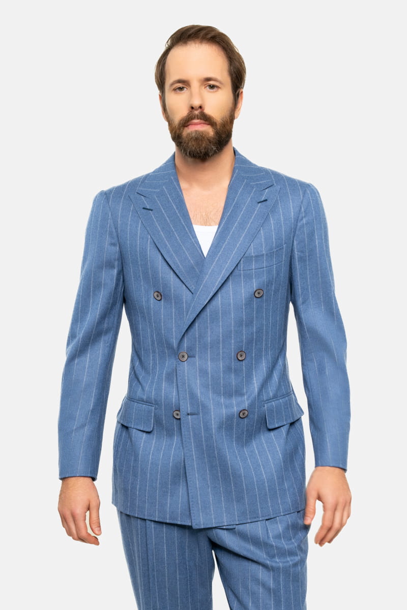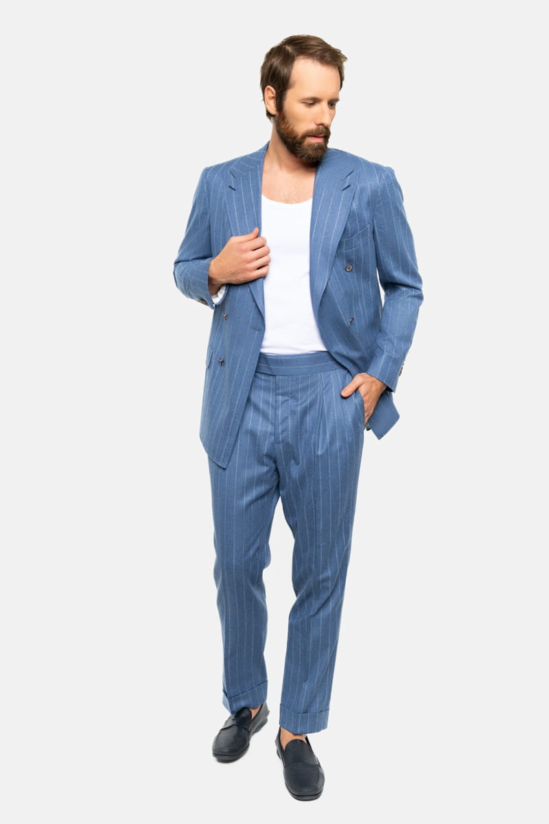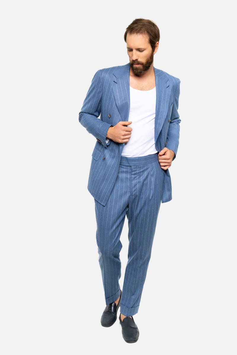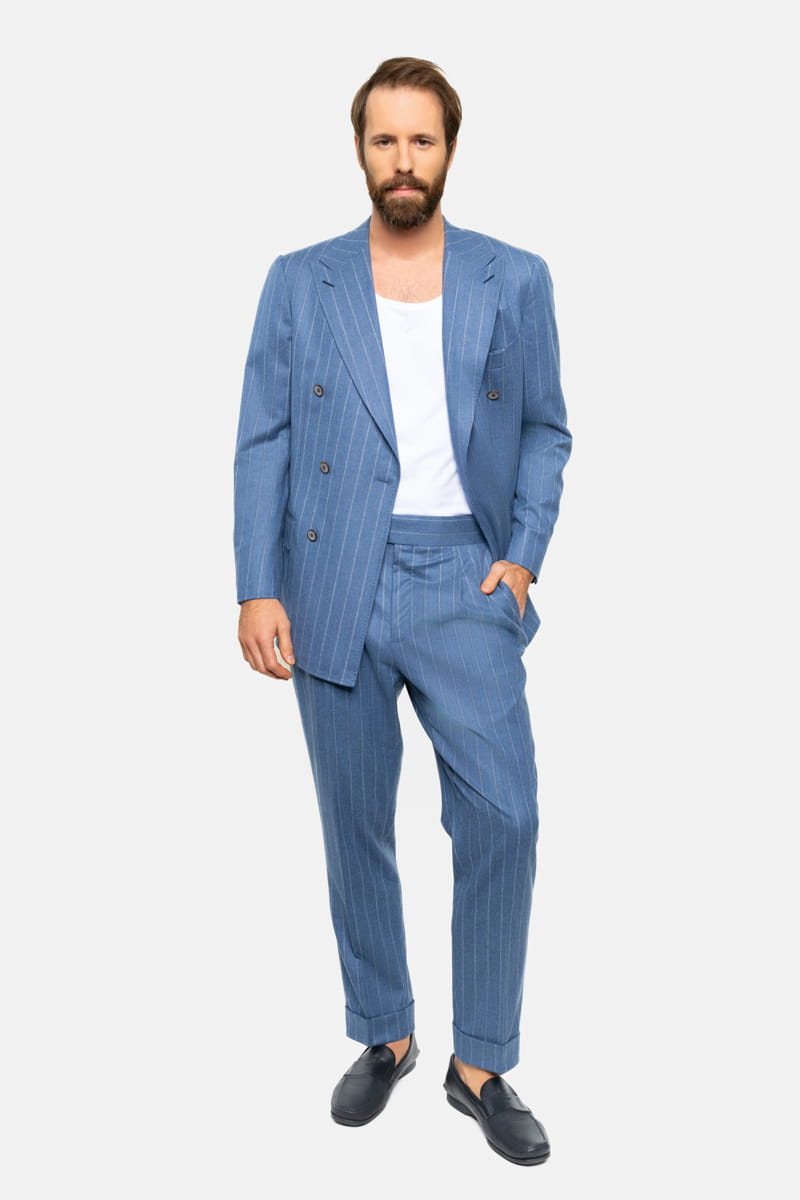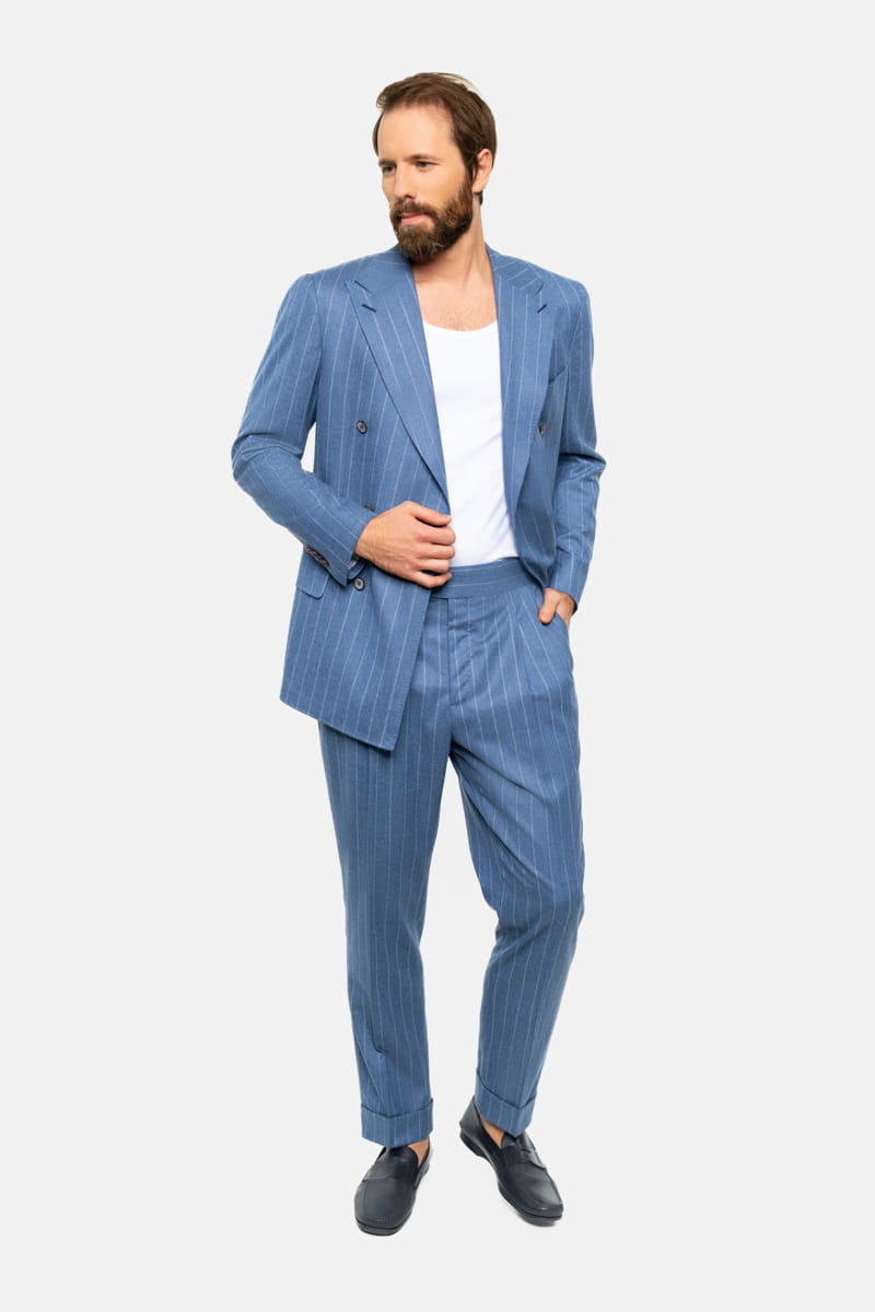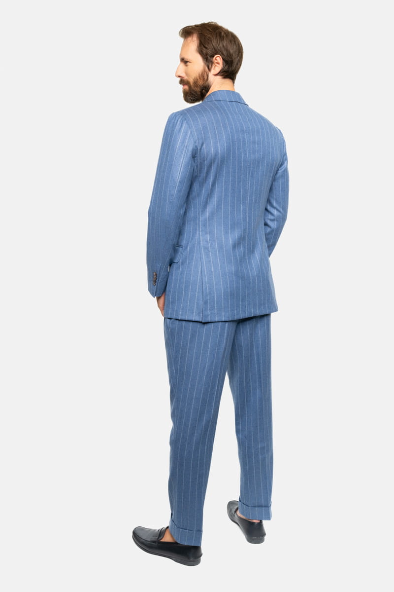 Ten elegancki garnitur w tenis w kolorze niebieskim, wykonany w całości z wełnianej flaneli od Vitale Barberis Canonico o gramaturze 270 g/mb, to idealny wybór przez cały rok. Tkanina charakteryzuje się wysoką jakością oraz miękkością, typową dla flaneli, która zapewnia komfort noszenia przez cały dzień, niezależnie od okazji.