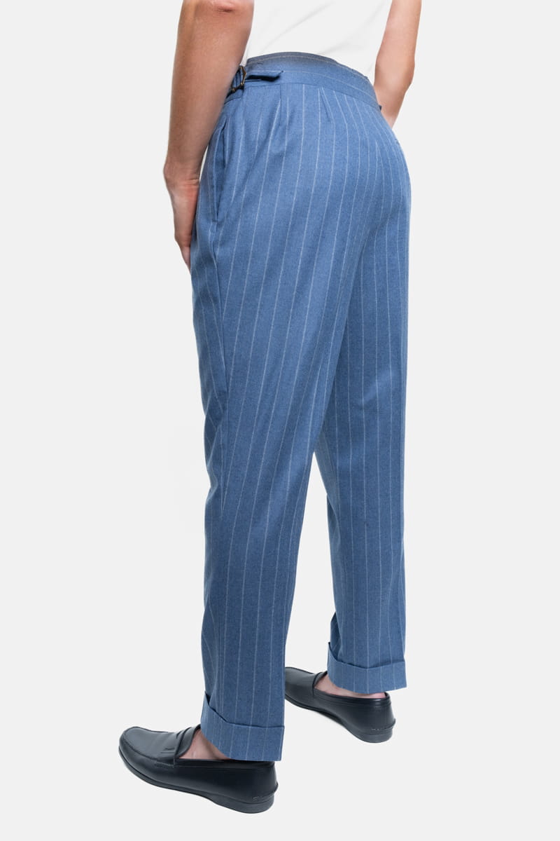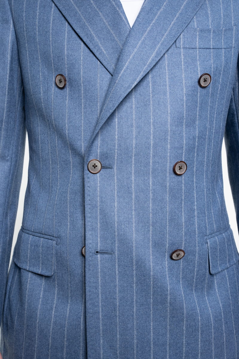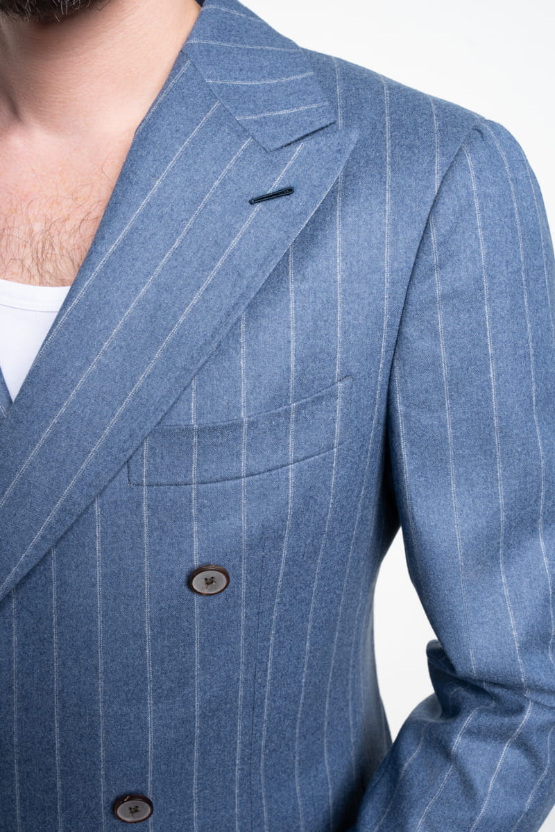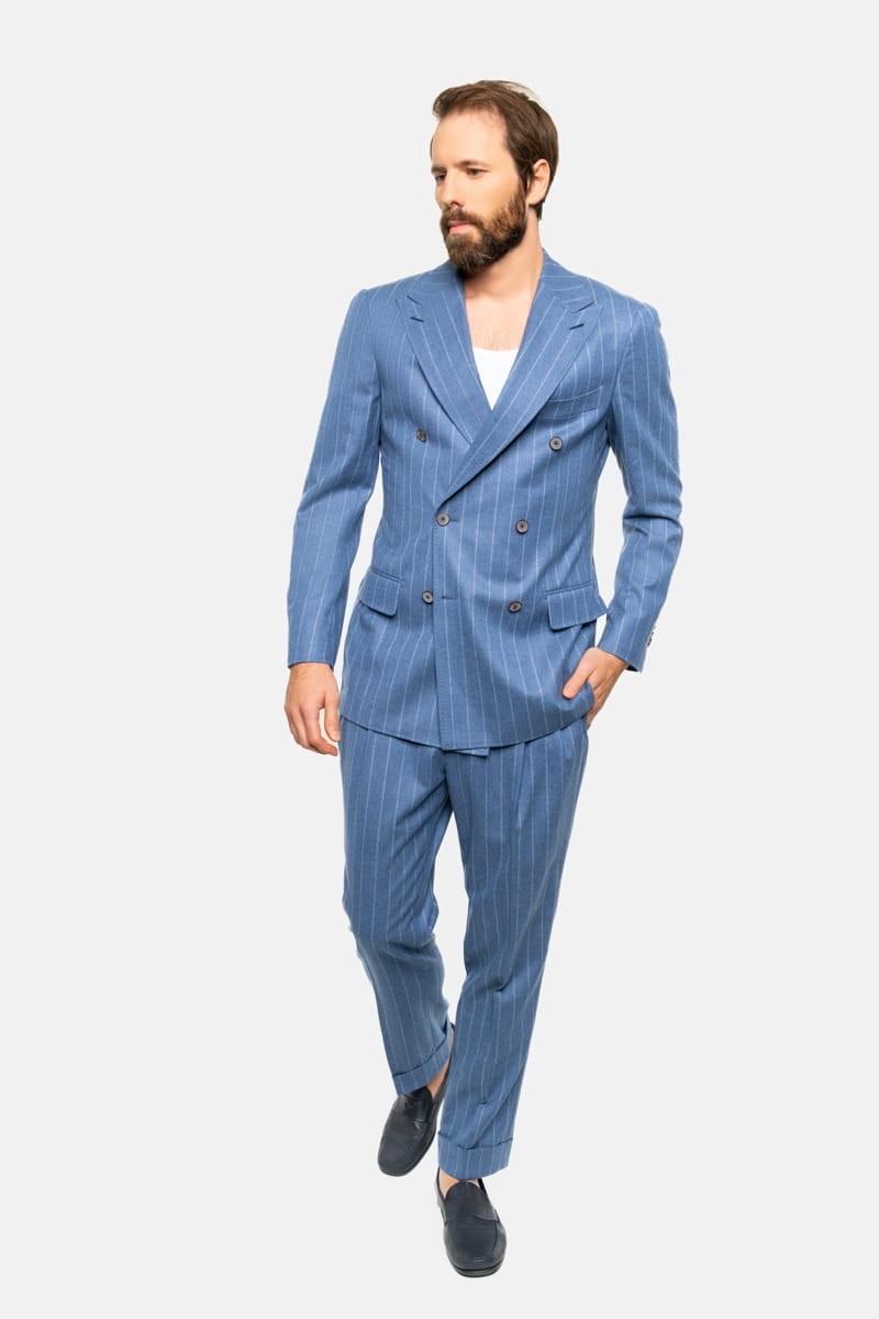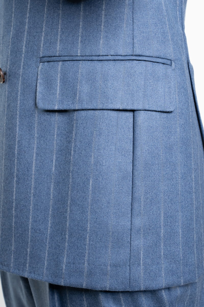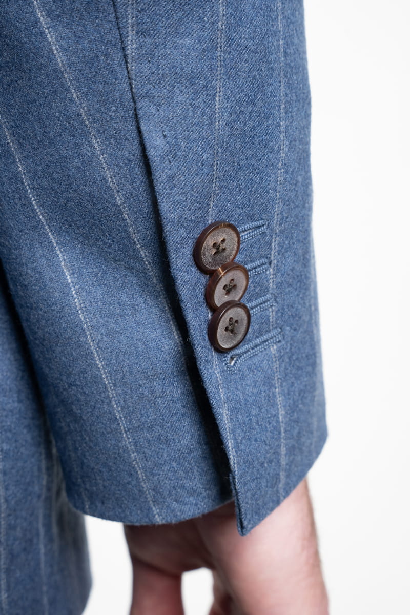 Ten elegancki garnitur w tenis w kolorze niebieskim, wykonany w całości z wełnianej flaneli od Vitale Barberis Canonico o gramaturze 270 g/mb, to idealny wybór przez cały rok. Tkanina charakteryzuje się wysoką jakością oraz miękkością, typową dla flaneli, która zapewnia komfort noszenia przez cały dzień, niezależnie od okazji.