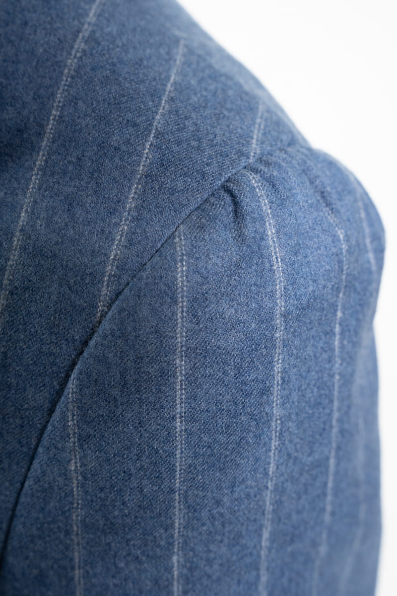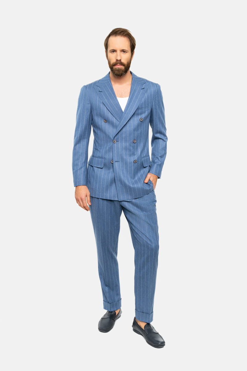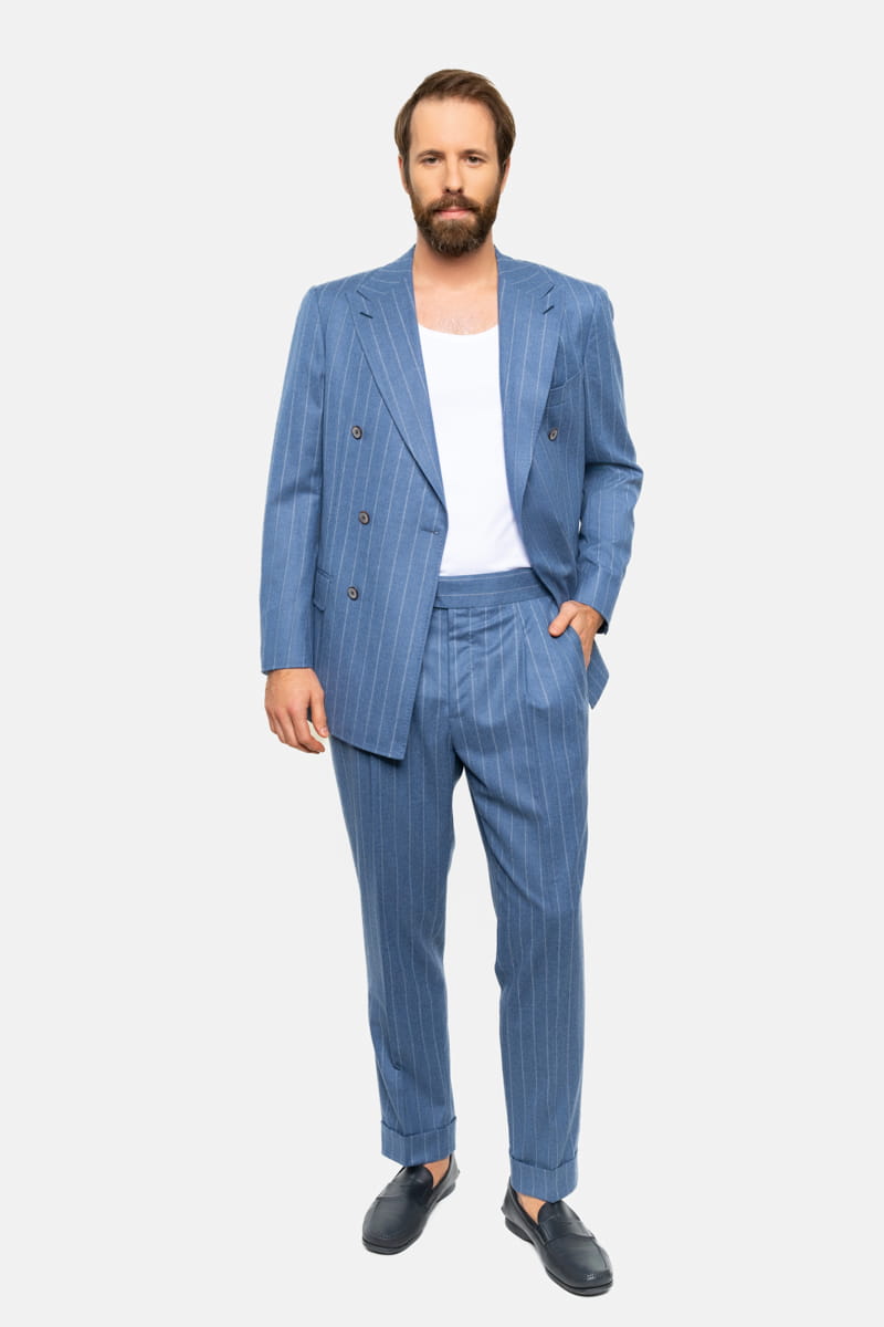 Niebieska flanela z delikatnym wzorem w tenis jest doskonałym wyborem zarówno do biura, jak i na bardziej formalne okazje, np. wieczorne wyjścia czy spotkania biznesowe. Dzięki naturalnym właściwościom wełny, garnitur jest idealny na chłodniejsze dni, zapewniając izolację termiczną przy jednoczesnym zachowaniu oddychalności.