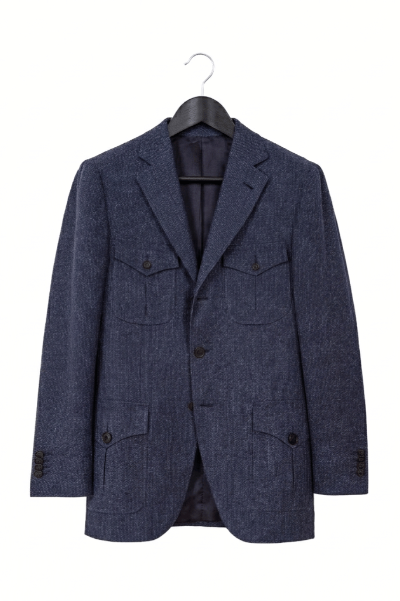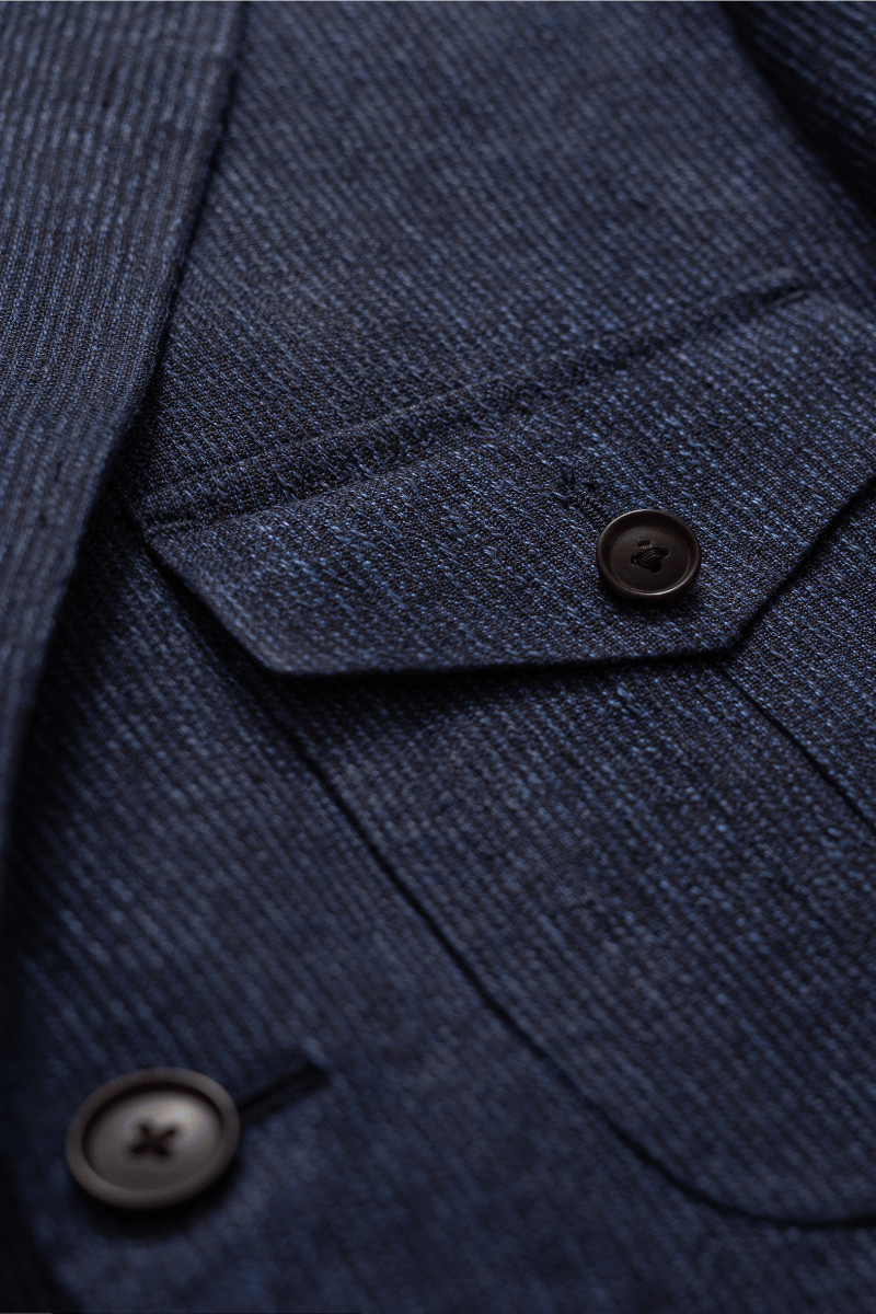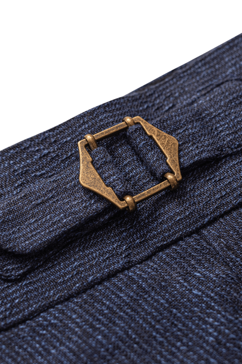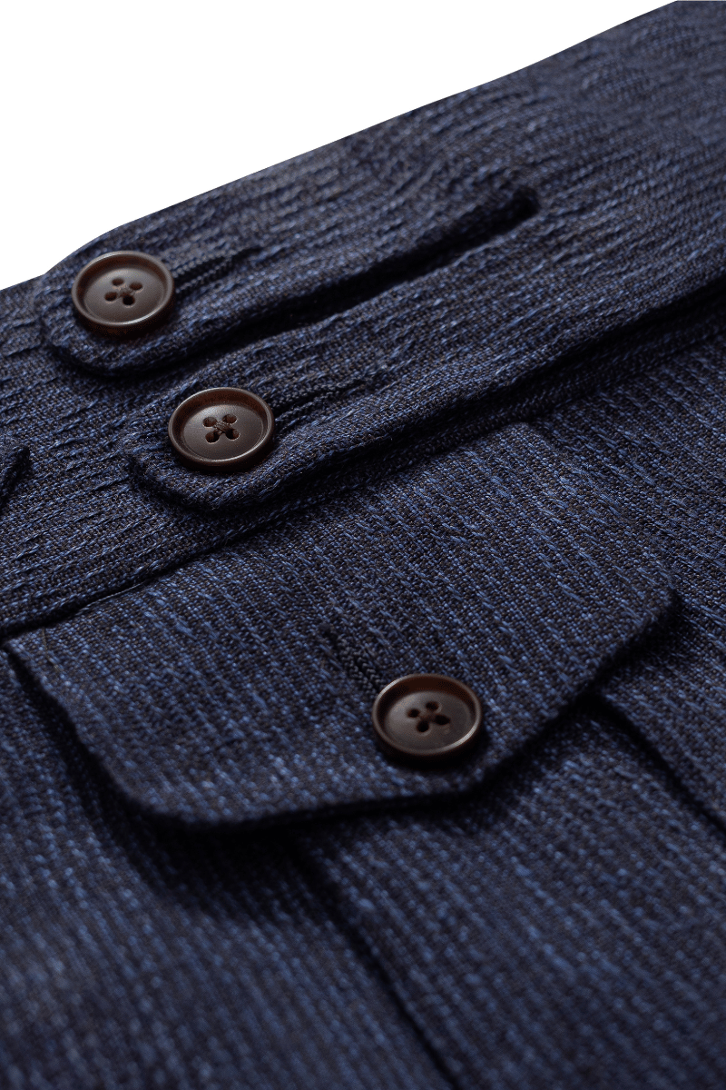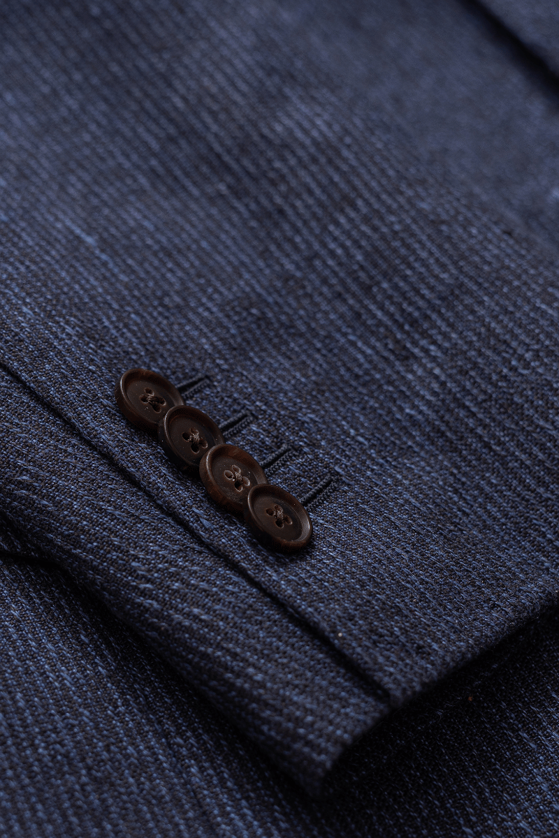 Marynarka garnituru Safari oparta jest na miękkiej konstrukcji half canvas w wersji odchudzonej – maksymalna lekkość przy zachowaniu naturalnego kształtu i dopasowania. Płótno krawieckie pracuje razem z tkaniną, nie przeciwko niej, nadając marynarce żywy, organiczny charakter typowy dla najlepszego lnianego krawiectwa.
