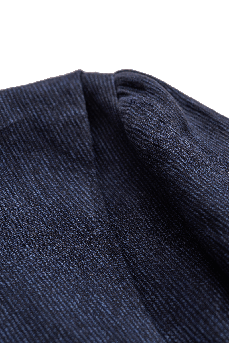 Tkanina garnituru Safari to 100% len o gramaturze 290 g/mb. – wystarczająco ciężki, by pięknie opadać i trzymać kształt, wystarczająco naturalny, by oddychać w każdych warunkach. Granatowy kolor nasycony i głęboki, charakterystyczny dla lnu barwionego w pełnym tonie.