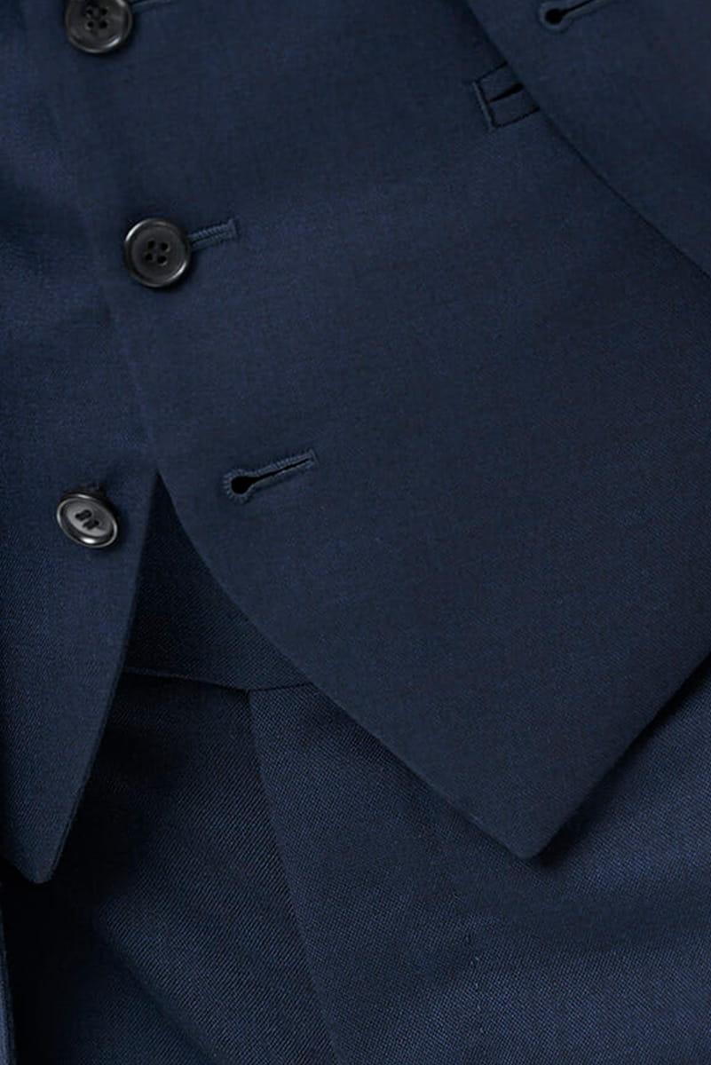 Kamizelkę wykonano ze 100-procentowej wełny w deseń sharkskin (skóra rekina). Tkainę tę sprowadzany prosto z Savile Row od firmy Huddersfield Worseds. Jest to renomowany dostawca materiałów dla krawców. Podszewka bemberg cupro z wiskozy doskonale uzupełnia całość. Wiskoza dobrze oddycha i jest wytrzymała. Guziki wykonano z rogu.