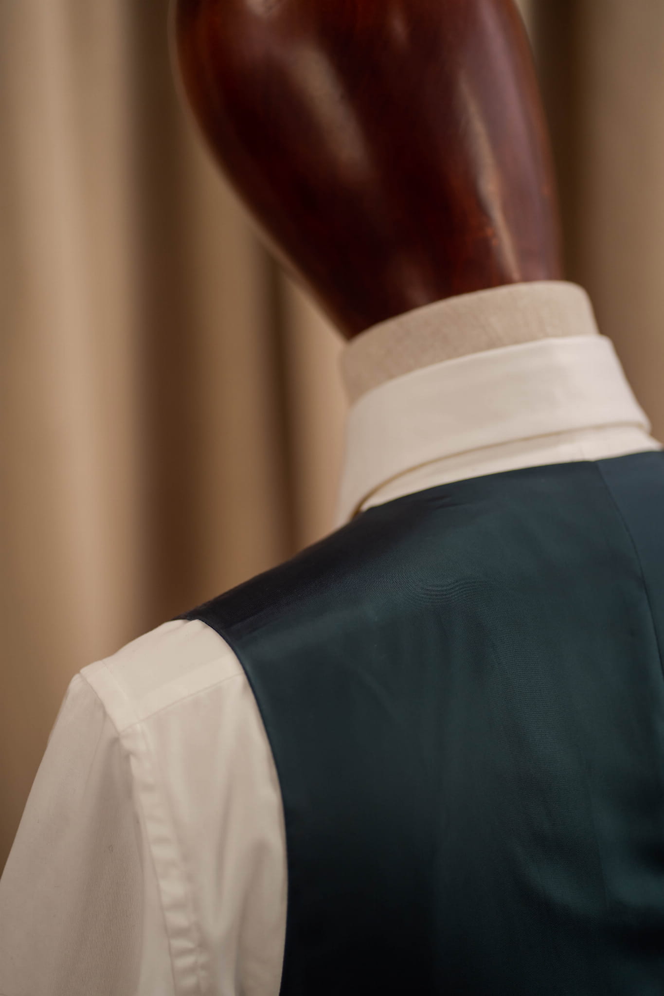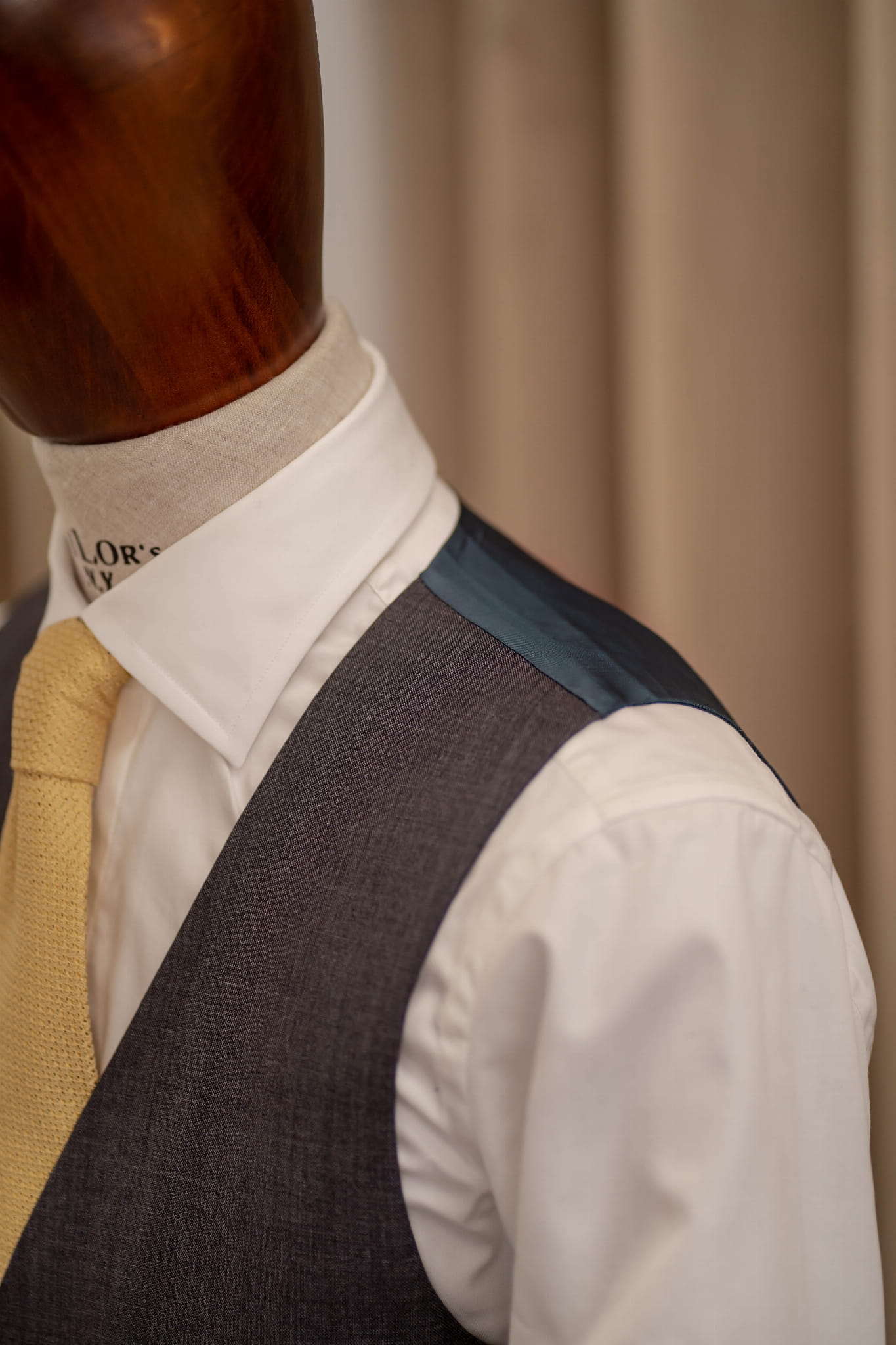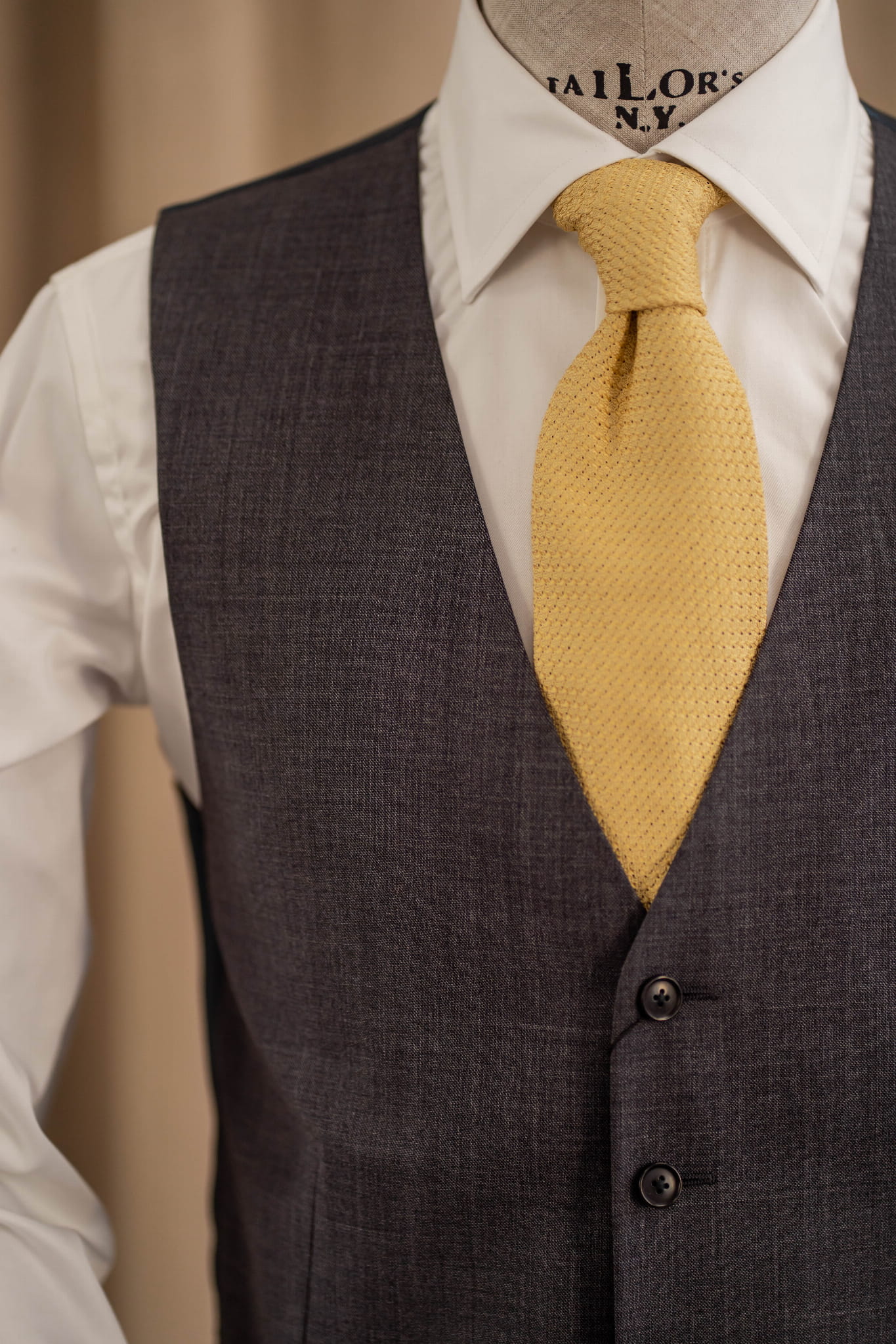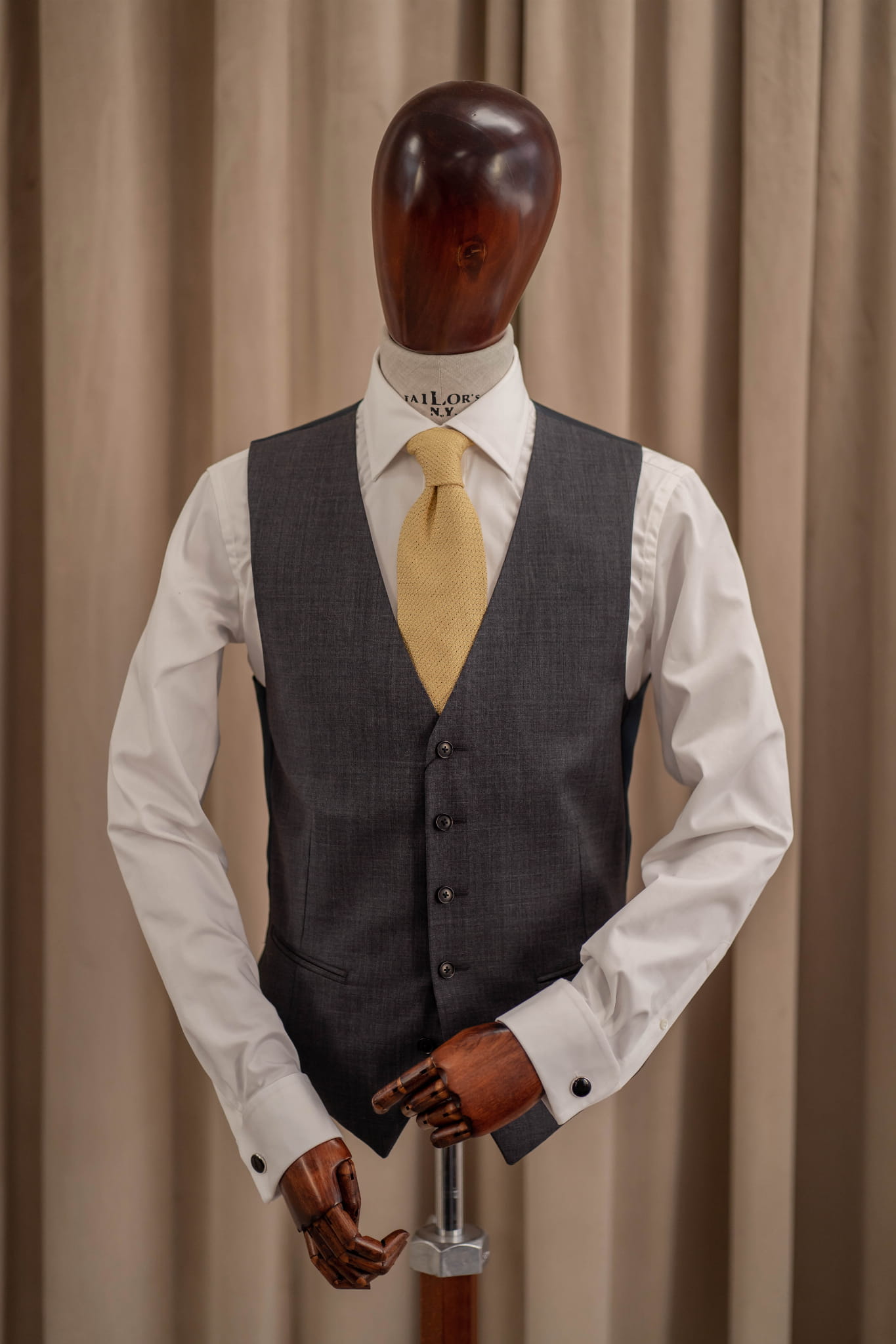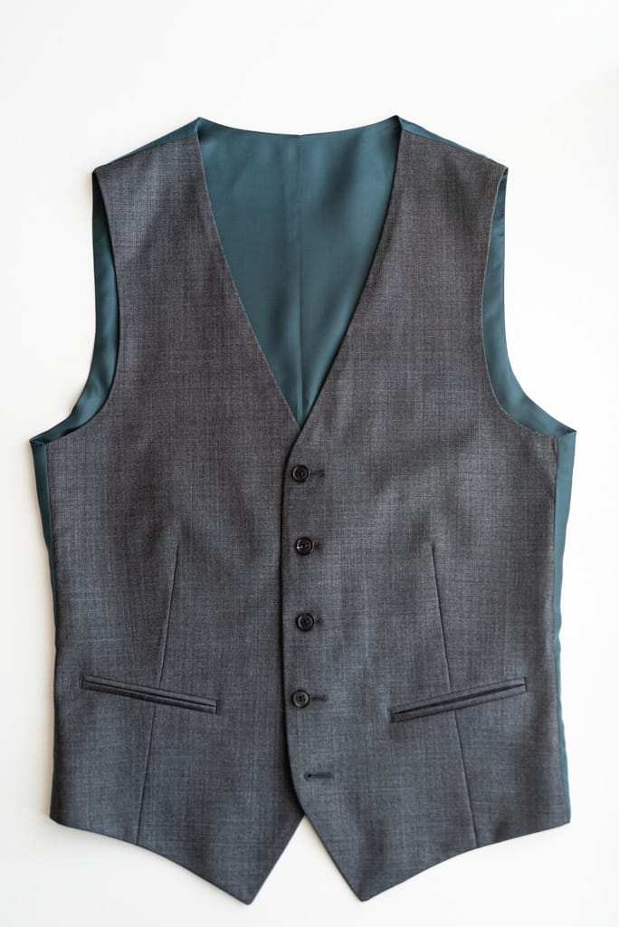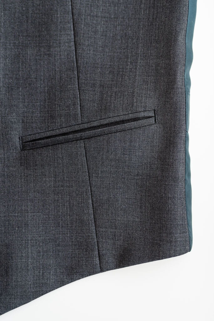 Jednorzędowa kamizelka Sharkskin to naprawdę dobry wybór dla każdego eleganckiego mężczyzny. Co więcej, materiał shark skin (fr. fil fil, czyli nić przez nić) jest niezwykle ciekawy przy bliższym poznaniu. W dosłownym znaczeniu! Kiedy się przyjrzysz trochę bliżej, to na materiale widać drobniutkie kreski w dwóch zbliżonych do siebie kolorach. Osnowa biegnie wzdłuż materiału, zaś wątek idzie w poprzek. Szara skóra rekina to połączenie nici białych i czarnych. W ten sposób otrzymujemy niebanalny efekt, który z pewnością zachwyci każdego konesera.