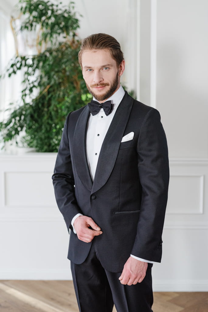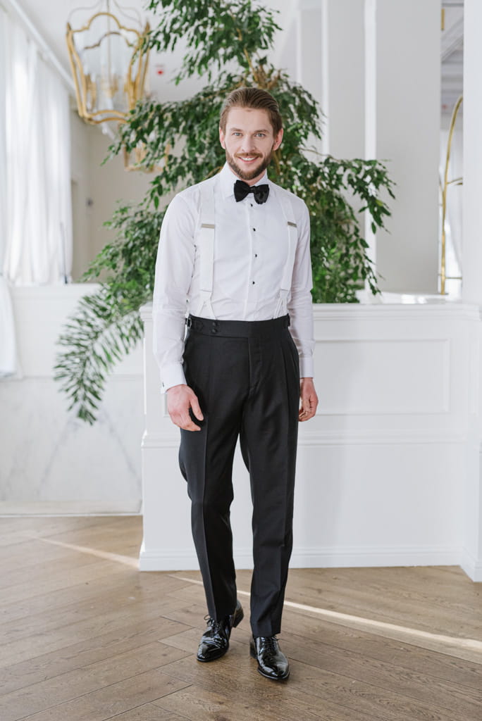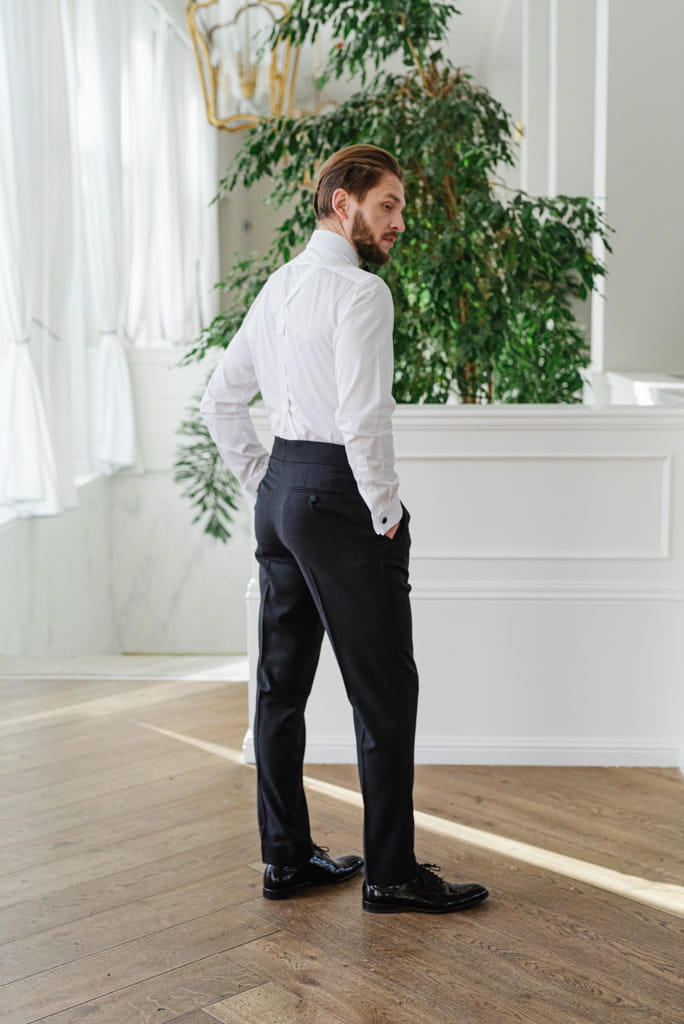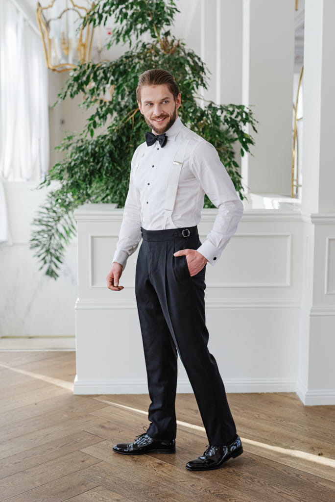 W tej białej koszuli smokingowej będziesz zawsze wyglądać elegancko, a poza tym wyróżnisz się z tłumu. Nasza koszula idealnie komponuje się z czarną muchą i czarnymi guzikami jubilerskimi. Dołącz do tego czarną kamizelkę i prezentuj się godnie - jak przystało na pewnego siebie, szanującego swoją wartość mężczyznę.