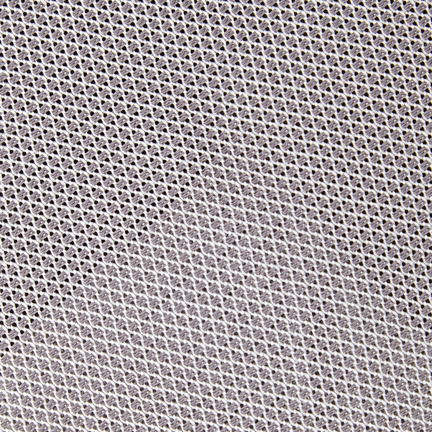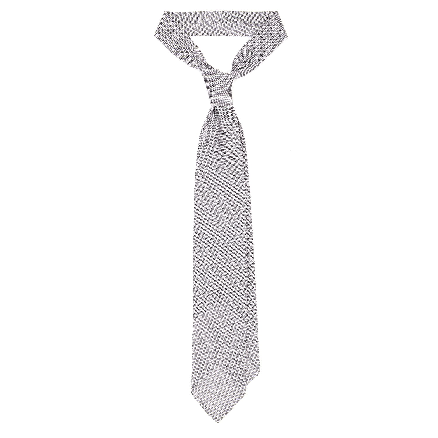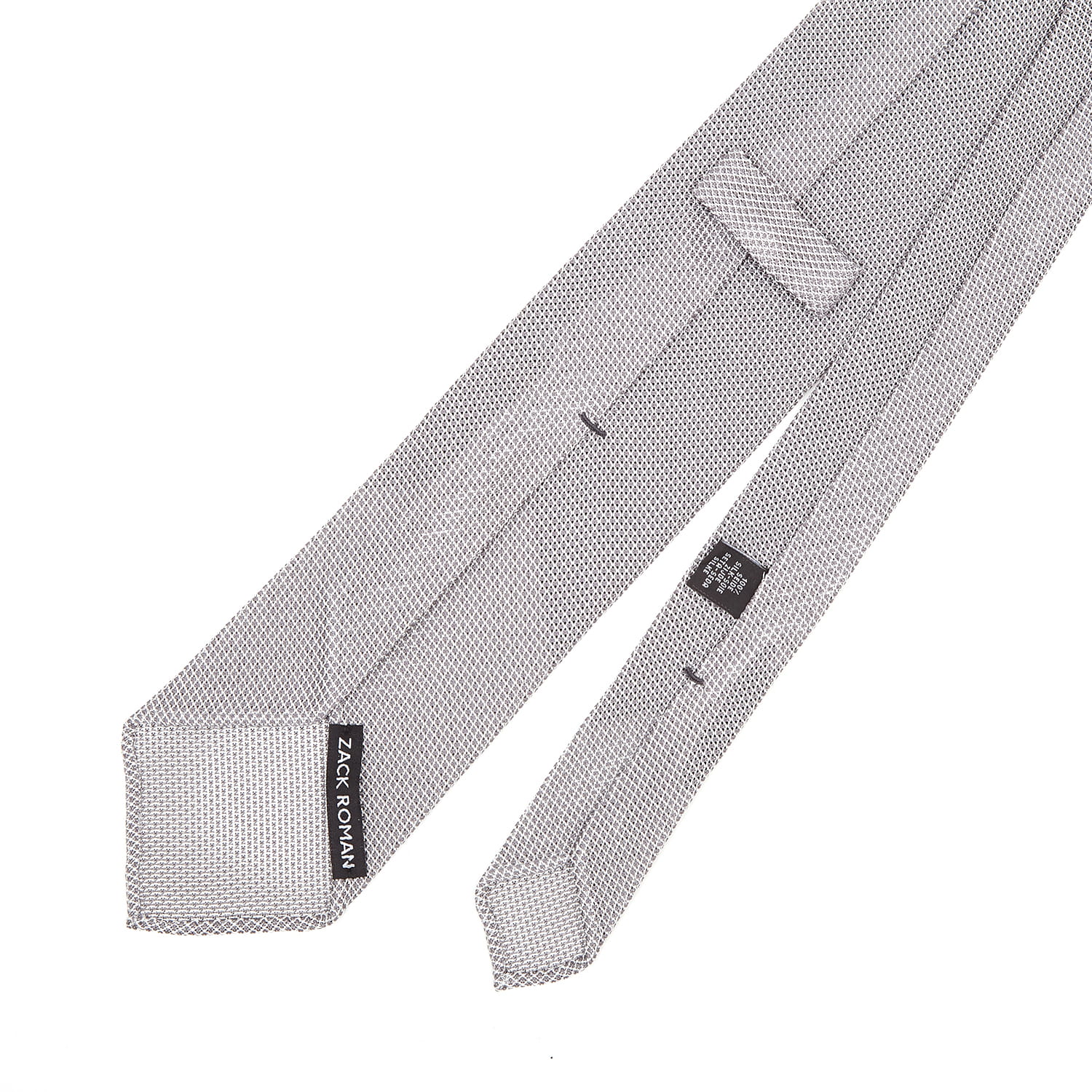 Srebrny krawat grenadyna uszyty ręcznie we Włoszech. Jest trzykrotnie złożony z jednego kawałka tkaniny (tzw. 3-fold).