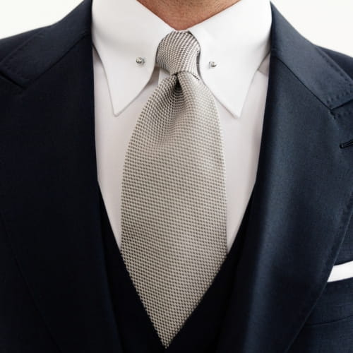 Charakterystyczny splot grenadyny, przypominający dzianiny, jest równie ciekawy jak drukowane wzory. Grenadyna ma wyraźnie trójwymiarową strukturę, dzięki której światło ciekawie gra na powierzchni. Krawat, choć wydaje się matowy, chwilami subtelnie połyskuje. To szczególny efekt, dlatego grenadyny są zazwyczaj utrzymane w konserwatywnej kolorystyce.
