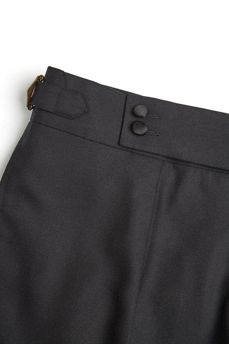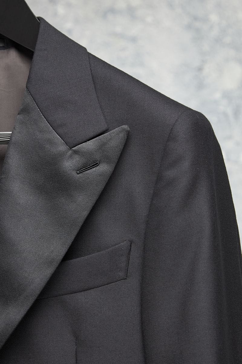 Przy wyborze tkaniny sięgnęliśmy do archiwum brytyjskiej firmy Huddersfield Fine Worsteds. Czarny faille (wym. faj) to gęsta tkanina poprzecznie prążkowana. Jej drobna faktura daje niecodzienny efekt wizualny. Ma delikatny, bardzo subtelny połysk wspaniale prezentujący się przy sztucznym świetle. Kapitalnie łączy się z czarnym wyłogami z jedwabiu. Jest to materiał utrzymany w klimacie vintage, a smokingu London z faille nie powstydziłby się sam James Bond.